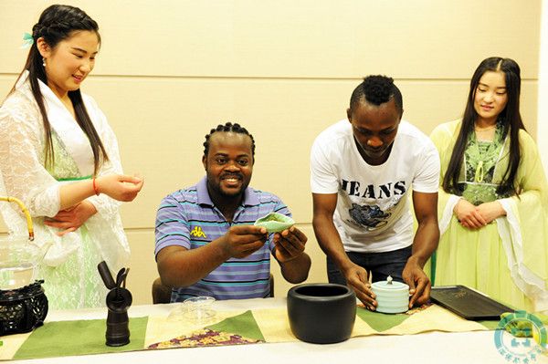 随着优雅的古筝乐曲,身着唐装的茶艺师们娴熟的展示着从洗手、温壶,烫杯,装茶,高冲,盖沫,淋顶,洗茶,洗杯,分杯到低斟,奉茶、闻香、品茗,一步步展现中国茶道固有的美。留学生们都被吸引住了,纷纷上台来实际操作,课堂气氛鲜活生动。