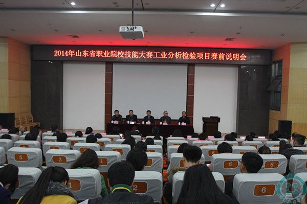 上午9点,在学院北区报告厅举行了赛前说明会。山东省教育厅职成教处调研员姜玉亭,山东省教研室段欣,大赛总裁判长、天津渤海职业技术学院王炳强教授,大赛副总裁判长、山东新华制药股份有限公司质检主任徐英,我院党委副书记、副院长姜义林等出席了开赛式。参加开赛式的还有来自山东省各参赛队领导、指导教师、参赛选手及我院师生代表等300余人。说明会上,姜义林致欢迎词。王炳强进行了赛事说明,东方仿真公司技术指导做了大赛软件使用说明,姜玉亭抽取了大赛理论试题。