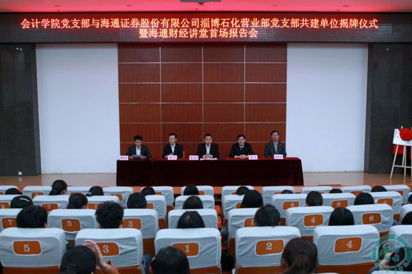 本站讯(通讯员 张莎莎)10月28日,会计学院与海通证券公司淄博石化营业部党支部共建单位揭牌仪式暨“海通财经讲堂”首场报告会在北区报告厅举行。学院党委副书记、副院长姜义林,海通证券公司淄博石化营业部总经理姜山,海通证券公司淄博石化营业部高级投资顾问韩冬,学院校企合作与就业指导处及会计学院负责人等出席会议,会计学院500余名师生参加了会议。
